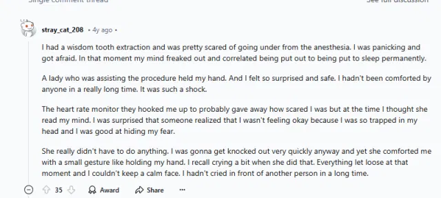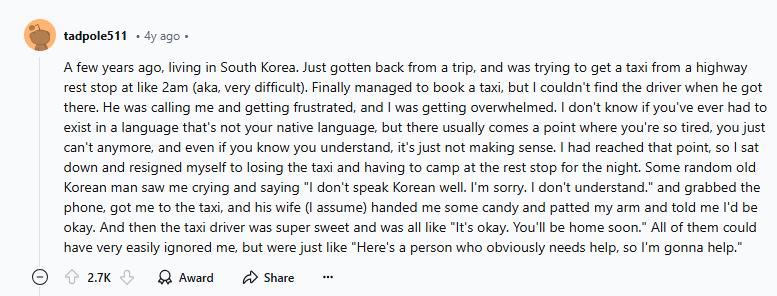 One time, I went through a drive-thru, and the girl at the window could tell I had been crying. She asked me if I was safe and gave me a free milkshake.