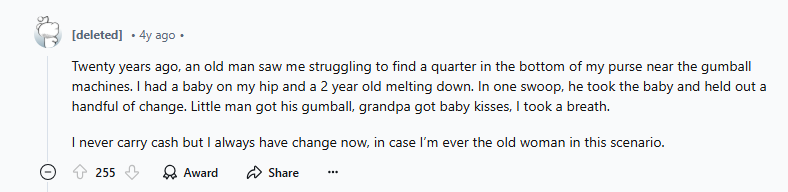 Her card got declined, and she looked really upset. She started putting it all back in the cart, trying to figure out what she could afford to pay for. The lady behind her in line stepped forward and said, “Put it all back; I’ll pay for it.” She put her card in the reader, and the first lady started crying, quietly thanking her.