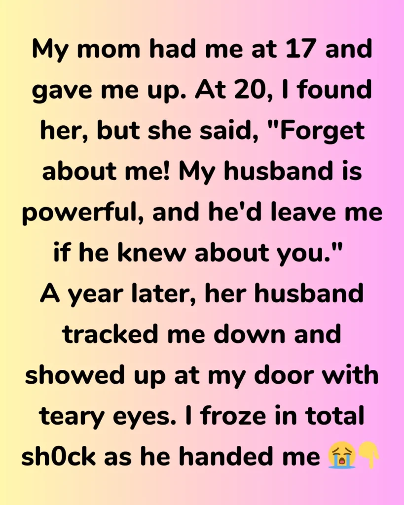 A year later, her husband tracked me down and showed up at my door with teary eyes. My entire reality shifted as he revealed that everything my mother told me that day was a complete lie.