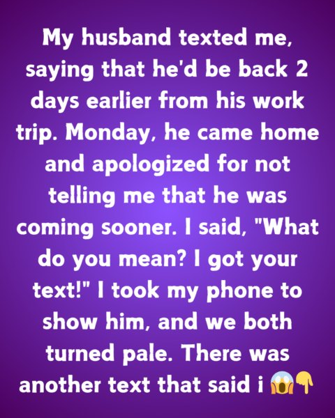 My spouse texted me to say he’d be back from his work trip two days earlier. He came home on Monday and apologized for not warning me he was coming sooner. I asked, “What do you mean?” “I received your text!”