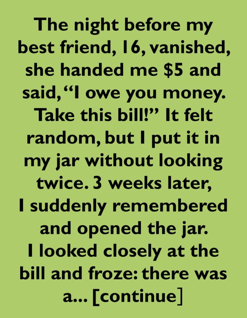 The night before my best friend, 16, vanished, she handed me $5 and said, “I owe you money. Take this bill!” It felt random, but I put it in my jar without looking twice. 3 weeks later, I suddenly remembered and opened the jar. When I examined the bill, my blood ran cold.
