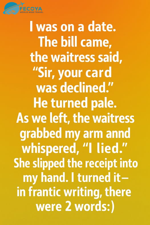 The waitress suddenly reached out and gently grabbed my arm. She leaned in close and whispered, “I lied.” Confused, I looked at her as she slipped a folded receipt into my hand before disappearing back inside. My heart raced with curiosity and hope as I unfolded the paper. There, written in hurried handwriting, were just two words—simple yet powerful. Those words changed everything I thought I knew about the night and reminded me how small acts of kindness can shine brightest when least expected.