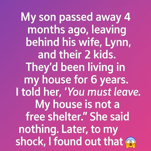 When my son passed away four months ago, my world changed in ways I never imagined. He left behind his wife, Lynn, and their two little ones, who had been living in my home for six years. The house that once echoed with laughter now felt heavy with silence and memories. I was grieving, but I was also overwhelmed. One day, I told Lynn she had to move out — I thought space would help us both heal.