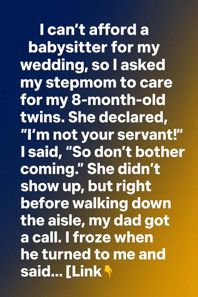 Planning a wedding while raising 8-month-old twins was no easy task. Money was tight, and every penny was already stretched thin between the ceremony, reception, and daily baby expenses. Hiring a babysitter for the big day felt completely out of reach.I decided to ask my stepmom for help. She had been part of my life for years, and I thought she might be willing to watch the twins during the wedding.
