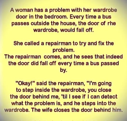 A woman kept having a strange problem with her bedroom wardrobe. Every time a bus passed outside, the wardrobe door would fall off. Tired of dealing with it, she called a repairman.