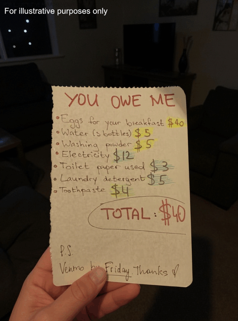 It was a bill with an itemized list for “living expenses” that seemed like a prank:
