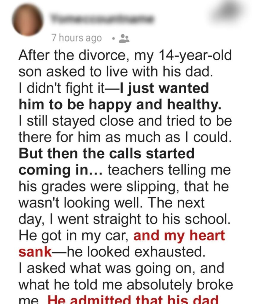 “After the divorce, my 14-year-old son asked to live with his dad. I didn’t fight it—I just wanted him to be happy and healthy. I still stayed close and tried to be there for him as much as I could. But then the calls started coming in… teachers telling me his grades were slipping, that he wasn’t looking well. The next day, I went straight to his school. He got in my car, and my heart sank—he looked exhausted. I asked what was going on, and what he told me absolutely broke me.