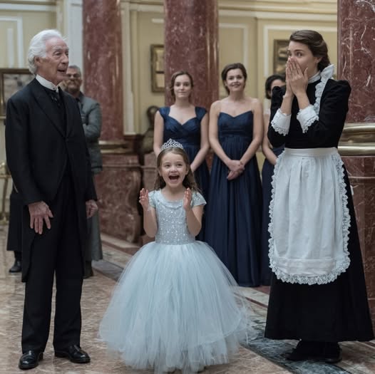 Emily did not look at the dresses. Or the hair. Or the diamonds. Her small shoes clicked through the hush as she walked past the line, eyes fixed on the far corner where a woman in a simple uniform stood very still, balancing a tray of water like it was the most important job in the world.