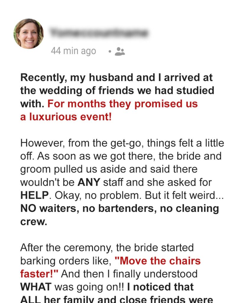 And so, instead of enjoying the wedding as guests, we became unpaid laborers. The ceremony was lovely, but the moment the couple said “I do,” Sarah turned into a drill sergeant, clapping her hands and barking orders to transform the lawn into a reception venue within twenty minutes.