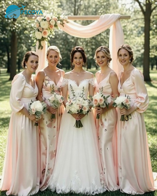 We unzipped the bags, and my heart immediately dropped. The dresses were indeed custom, but they looked like something from a theater costume shop. Shiny satin in an oddly pale peach color, with puffy sleeves and sequins scattered across the bodice. They were flashy in a way that screamed more high school prom than elegant wedding.
