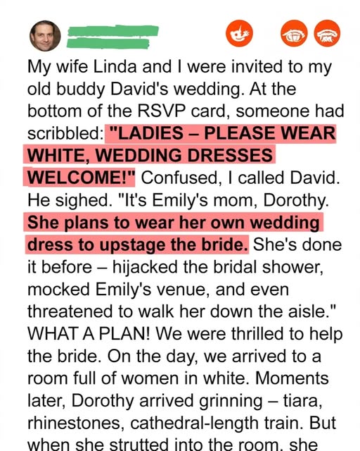 The Invitation That Sparked Suspicion – When David and Emily’s wedding invitation arrived, my wife Linda was the first to notice something odd. At the bottom of the RSVP card, written in elegant, dramatic handwriting, was a strange request: “Ladies — please wear white, wedding dresses welcome!” Everyone knows that wearing white to someone else’s wedding is a major faux pas, so naturally, we were baffled. When I called David to ask about it, he sighed and revealed the truth — Emily’s mother, Dorothy, had decided she was going to wear her old wedding gown to outshine her own daughter on her big day. But Emily had a plan.