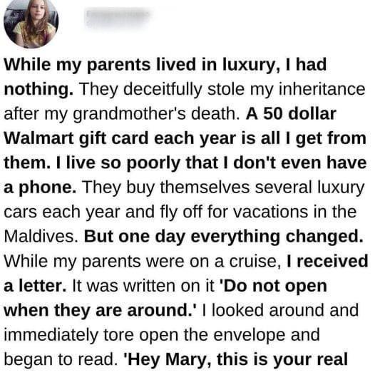 After taking a quick look around, I tore open the envelope and started to read right away. “Hi Mary, this is your real dad.” It’s been years since I last saw you. I’ve been working hard to get back the money your grandma left you as an inheritance. Come to the address given and meet me there. It’s time to take back what’s properly yours and make your life better.