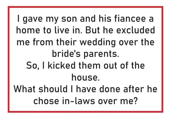 John’s unwelcome surprise Upon reaching his Pennsylvania house, John was shocked to find Lisa and her family occupying the residence. It appeared they had moved in without notifying Mark or seeking his permission. When Lisa’s family asked the man why he was there, he explained his purpose — to speak with his son about the wedding situation. In response, they insisted he leave the house, which led the man to make a significant decision. He recounted: “I lost it and told them that they had 30 days to get out. Tell my son I’m selling the house, and he could find somewhere else to live with all of you. I go to a realtor in town and list the house for sale.” This was done while Mark wasn’t present. In fact, Lisa decided to call Mark at work, informing him of the situation. She believed that the house belonged to him, not his father. Upon hearing the news, Mark phoned his father, inquiring about the house sale. John explained that since his son had chosen to distance himself from the family, he was to be out of the house, given that he was living there rent-free. John’s perspective was that in-laws had taken over and his family was no longer a priority. Subsequently, John gave the Mark, Lisa, and Lisa’s family a 30-day notice to vacate the property, warning that a lawyer would be involved if necessary. Many people on Reddit took John’s side, saying that kicking Mark and Lisa, as well as Lisa’s rude family, out of the house was definitely the right thing to do.