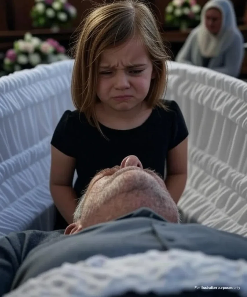 As the ceremony drew to a close, the little girl was lifted by a family member and brought closer to the open coffin. The room fell into reverent silence.