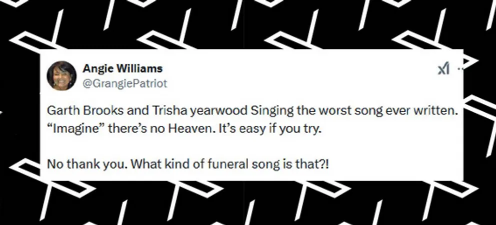 Others took a hit at the song directly, writing, “Garth Brooks and Trisha Yearwood Singing the worst song ever written. ‘Imagine’ there’s no heaven. It’s easy if you try. No thank you. What kind of funeral song is that?! [sic]” More users questioned the song’s appropriateness, “Why would you sing this song at a Christian funeral? Weird.”