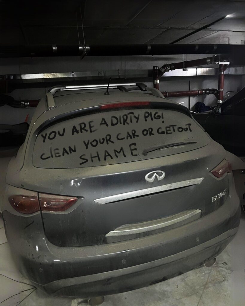 The message read, “YOU ARE A DIRTY PIG! CLEAN UP YOUR CAR OR GET OUT OF THE COMMUNITY. SHAME! SHAME! SHAME!”