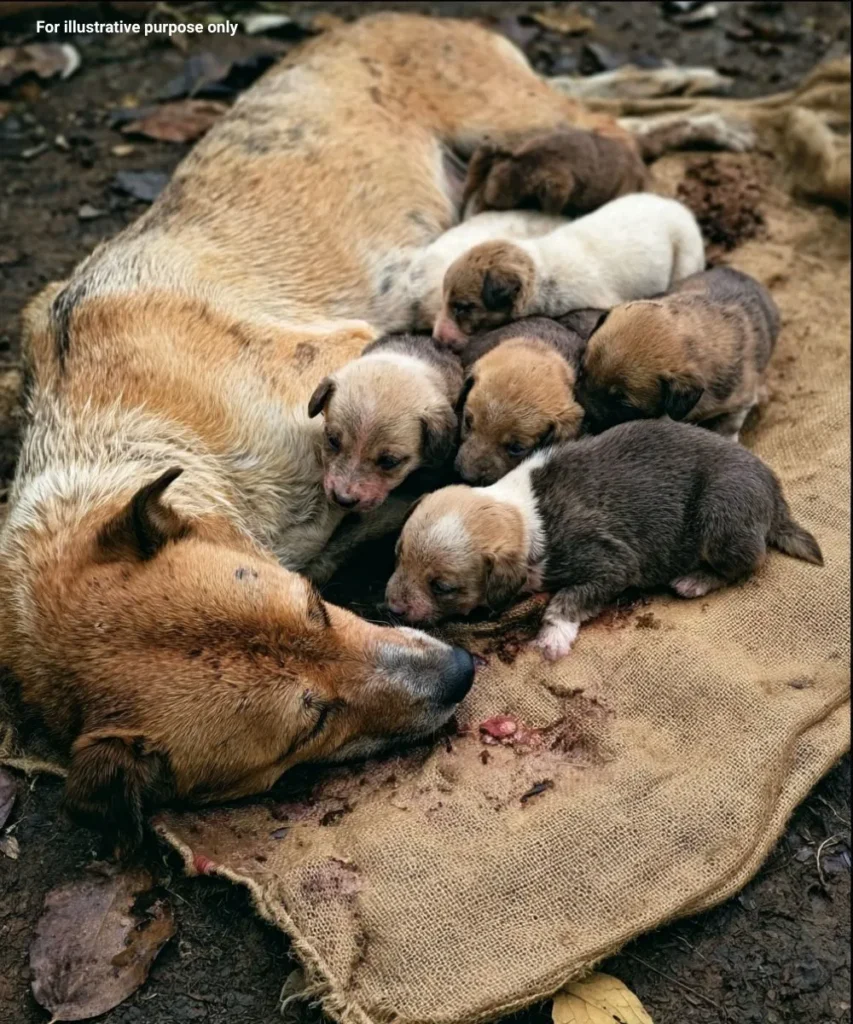 The image of a mother dog laying motionless amid rubbish with her delicate pups cuddled up was heartbreaking to a kind stranger.