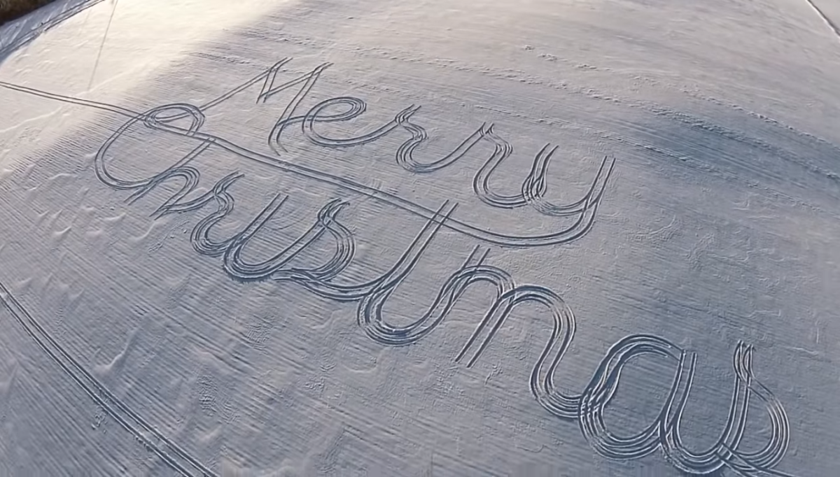 The breathtaking footage provides an aerial view of the snow-covered fields, where the delicate curves of the words emerge like a festive masterpiece. Capturing the creation from above adds a unique dimension, turning a simple farm activity into an awe-inspiring visual experience.