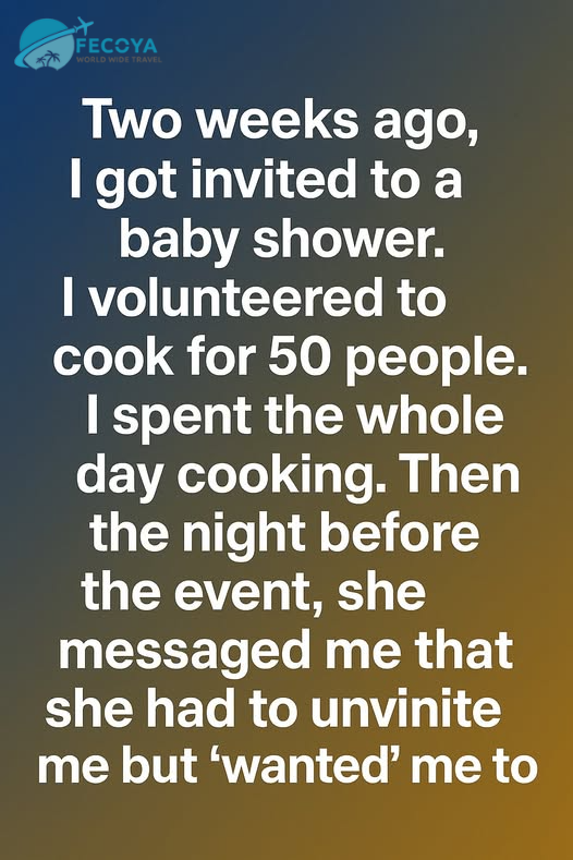 Two weeks ago, I got invited to a baby shower. I volunteered to cook for 50 people. I spent the whole day cooking. Then the night before the event, she messaged me that she had to uninvite me but “wanted” me to still bring the food. At first, I thought I misunderstood. I reread the message twice, expecting some kind of explanation or apology, but there was none. Just a cheerful note asking me to drop everything off early. I had spent hours preparing dishes, thinking I was doing something kind and helpful for someone I cared about.