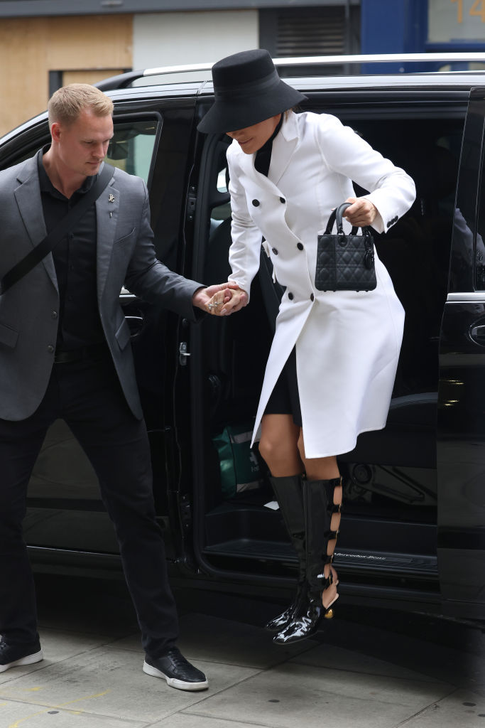 The 55-year-old star was all smiles as she held onto the stern-looking guard while stepping out of a large black SUV, even though she was wearing modest kitten-heel boots, a stylish black hat, and a small purse.