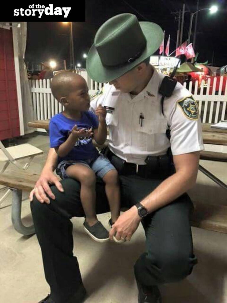 The trooper smiled softly and pointed to Jalen’s chest. “I told him he’s in charge until Mom shows up,” he said. He gave Jalen his badge while they waited. Reported that Jalen felt ‘important’ and peaceful.