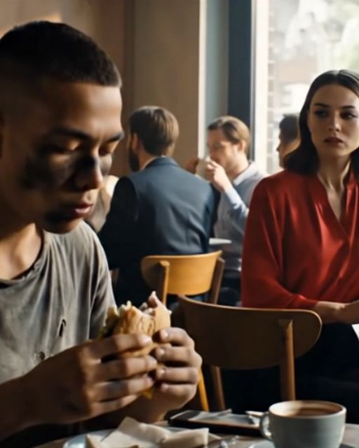 He sat alone. Ordered nothing. Just unfolded a napkin like it meant something, set it down carefully, and stared into his hands.