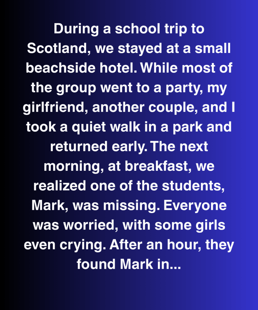 During a school trip to Scotland, we stayed at a small beachside hotel. While most of the group went to a party, my girlfriend, another couple, and I took a quiet walk in a park and returned early. The next morning, at breakfast, we realized one of the students, Mark, was missing. Everyone was worried, with some girls even crying. After an hour, they found Mark in an old fishing shed down the beach, asleep, cold, and soaking wet.
