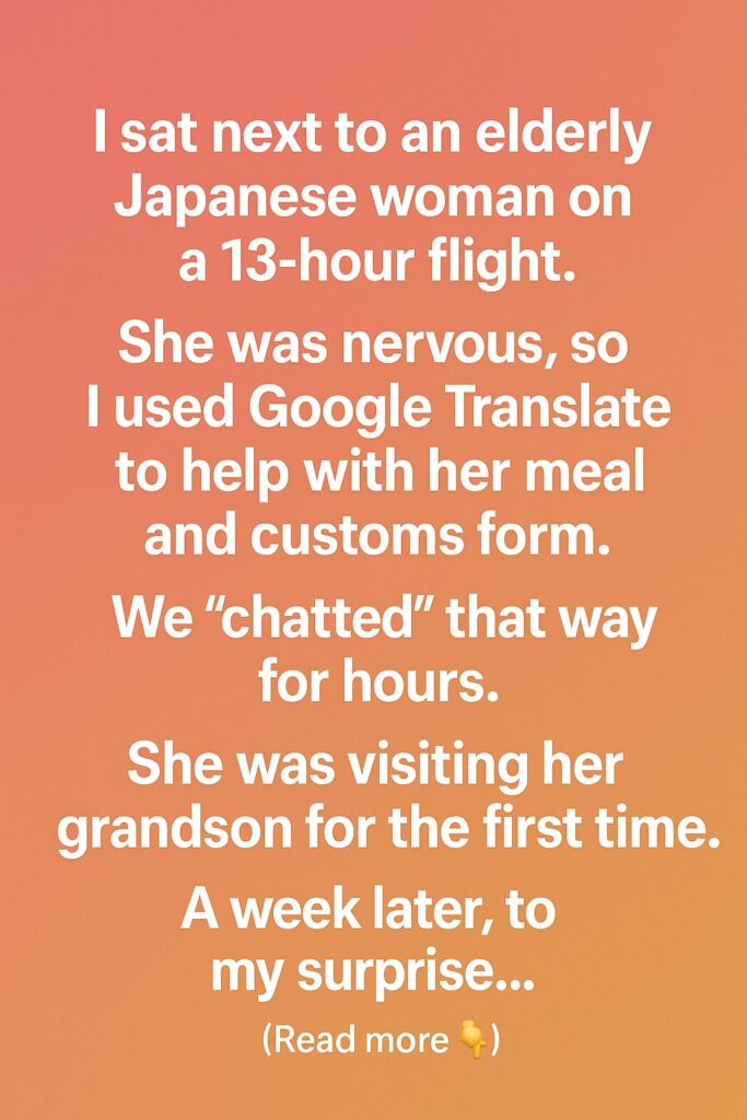 A week later, I got a message on social media from her grandson. He had found me online and wrote: “My grandmother said you were her angel on the flight. She wants to thank you properly. Please come to dinner with us.” That evening, I sat around their table, surrounded by food, laughter, and warmth. What began as a seat assignment on a long flight turned into a friendship that reminded me how kindness can bridge any language, culture, or distance.