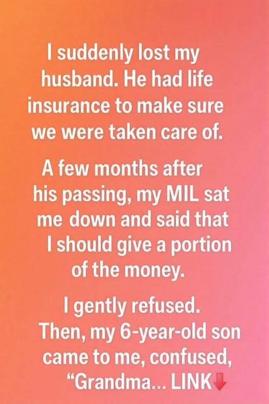 I suddenly lost my husband. He had life insurance to make sure we were taken care of. A few months after his passing, my MIL sat me down and said that I should give a portion of the money. I gently refused. Then, my 6-year-old son came to me, confused, “Grandma…” he whispered, as if unsure whether he was allowed to continue. I knelt down and asked what he meant, and he explained that she had talked to him too—telling him that “sharing is what good families do.” His small voice carried a weight he didn’t understand, and hearing it made my heart ache.