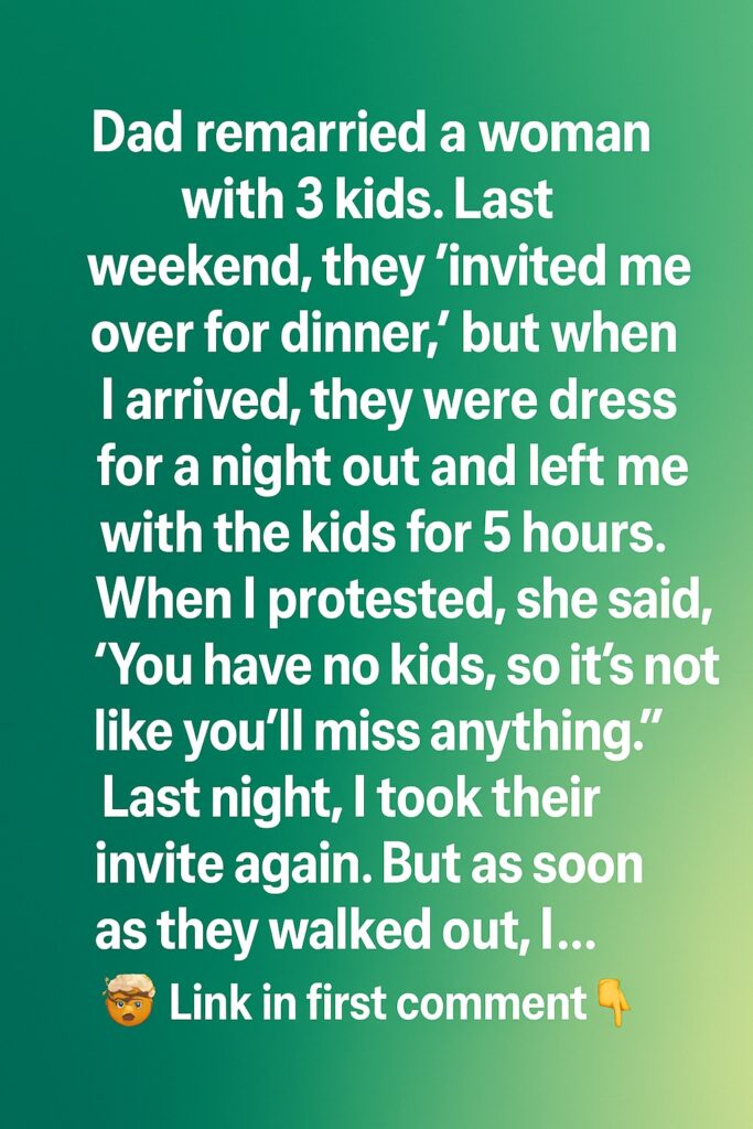 Confused, I asked, “Wait… where are you going?”My stepmother smiled and said, “Oh, just a quick date night! You don’t have kids, so it’s not like you’ll miss anything.” And just like that, they walked out, leaving me with three kids I barely knew. spent five long hours playing babysitter without warning. The kids were sweet, but I was frustrated. When my dad and stepmom came home, I tried to explain how unfair it was. She just brushed me off, saying, “You’ll understand when you have children.”