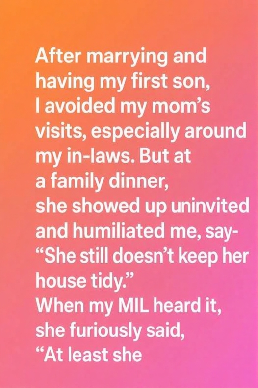 After marrying and having my first son, I avoided my mom’s visits, especially around my in-laws. But at a family dinner, she showed up uninvited and humiliated me, saying—”She still doesn’t keep her house tidy.” When my MIL heard it, she furiously said, “At least she tries her best while raising a newborn, and we support her instead of criticizing.” The room grew uncomfortably quiet, and I felt the familiar sting of old wounds—ones I had spent years trying to outgrow.