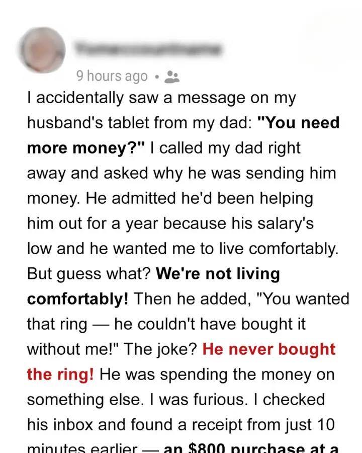 My hands were shaking. My stomach flipped. Why was my husband spending $800 at some fancy boutique while my dad was secretly paying our bills?