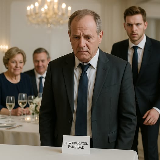 Until I saw the place card. At the family table, right beneath the golden father of the groom label, was my name, followed by a phrase someone had added in mock cursive with a gold pen, Low Educated Fake Dad. I blinked.