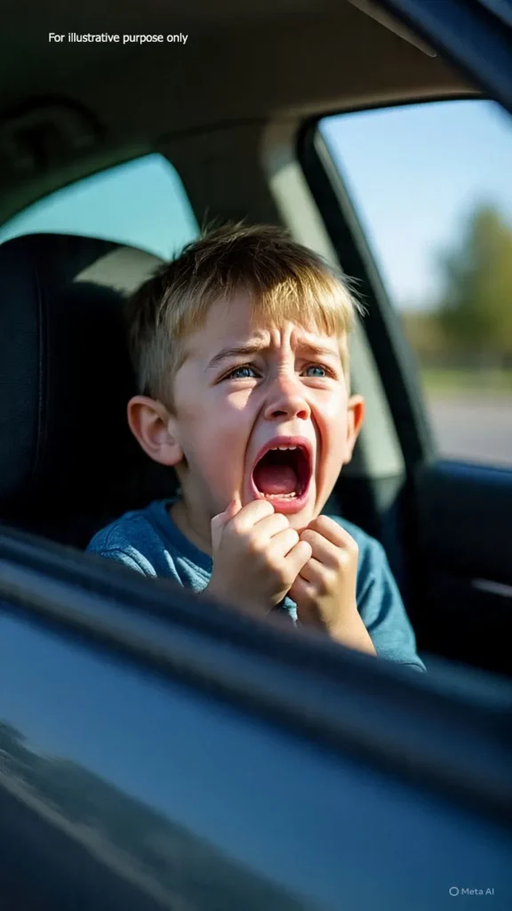 In a white sedan’s passenger seat, he pounded his fists at the glass, blushing and crying. The windows were sealed. No adults were around.