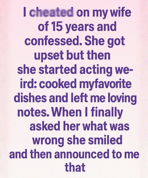 In the days that followed, she started to act with a strange tenderness. She cooked my favorite dinners, left small notes by my coffee, asked softly if I needed anything before leaving for work.