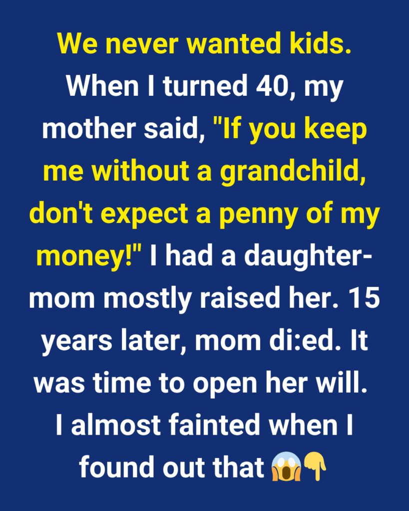 My husband and I, we never wanted kids. When I turned 40, my mother said, “If you keep me without a grandchild, don’t expect a penny of my money!” I had a daughter-and my mom mostly raised her.