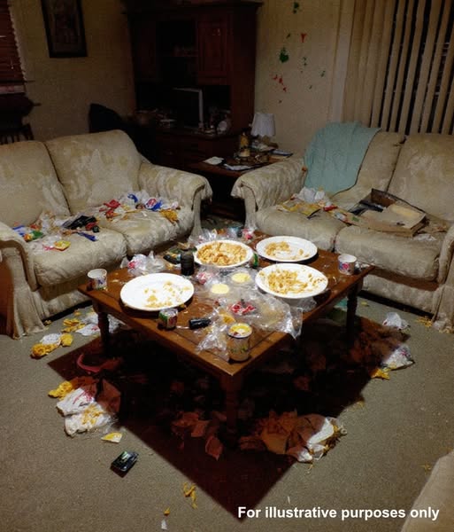 The living room looked like a disaster zone. Fast-food wrappers littered the floor. Greasy takeout containers sat open, with half-eaten burgers oozing sauce. Soda cans were scattered everywhere, and someone had crushed chips into the carpet.