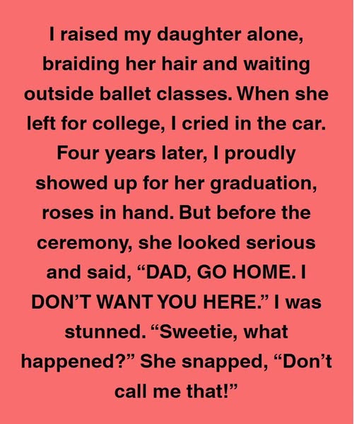 I raised my daughter alone, braiding her hair and waiting outside ballet classes. When she left for college, I cried in the car. Four years later, I proudly showed up for her graduation, roses in hand. But before the ceremony, she looked serious and said, “Dad, go home. I don’t want you here.” I was stunned. “Sweetie, what happened?” She snapped, “Don’t call me that!”