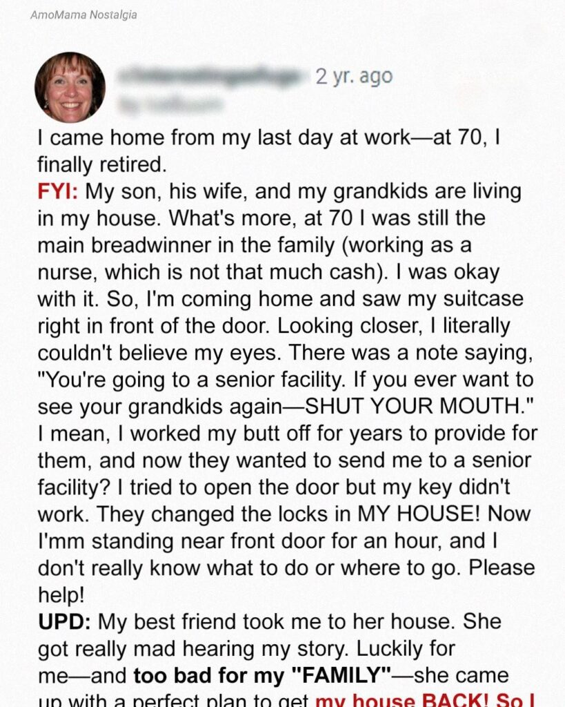 When I retired at 70 after nearly four decades at the clinic, I brought home a cake to celebrate with my son Thomas, his wife Delia, and my grandkids—only to find my suitcases on the porch and the locks changed. A note from Delia claimed I’d “moved to a senior facility by choice” and warned me to keep quiet if I wanted to see the kids again. Heartbroken, I crossed the street to my best friend Bonnie’s house. She gave me tea, a place to stay, and a promise: we’d get to the bottom of this.