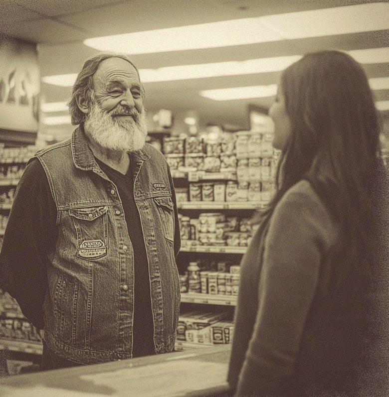 “Ma’am,” he responded gravelly, “I have exactly forty-seven dollars and eighty-three cents here. My grocery bill is $51.20. If I take too long, I’ll put something back.”