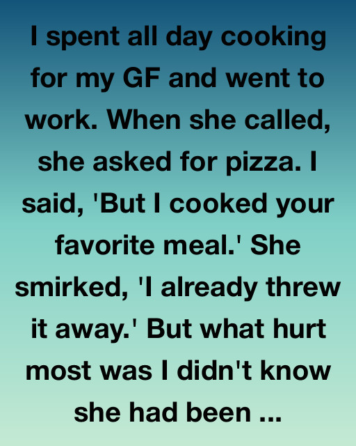 I spent all day cooking for my GF and went to work. When she called, she asked for pizza. I said, “But I cooked your favorite meal.” She smirked, “I already threw it away.” But what hurt most was I didn’t know she had been cheating on me for months.