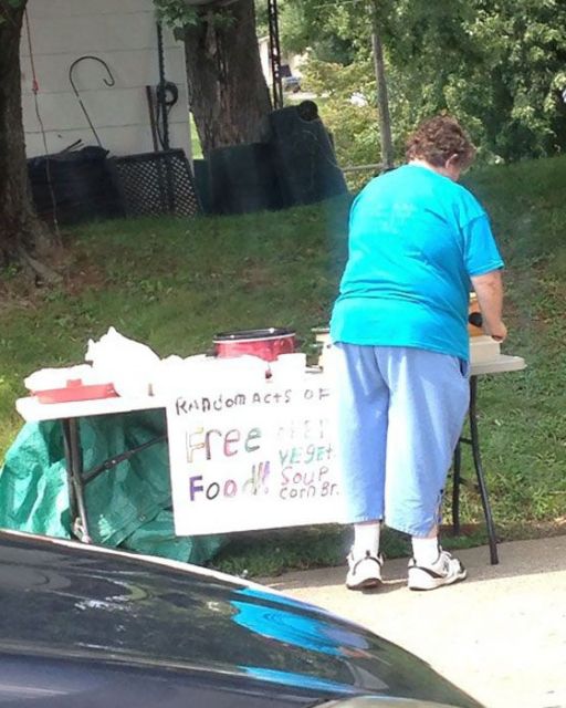 She’d been out there all week—same folding table, same handwritten sign that said “Random Acts of Free Food!! VEG Soup & CornBr.” Always smiling. Always waving. And always standing out there like someone who knew she wasn’t being noticed, but kept showing up anyway.