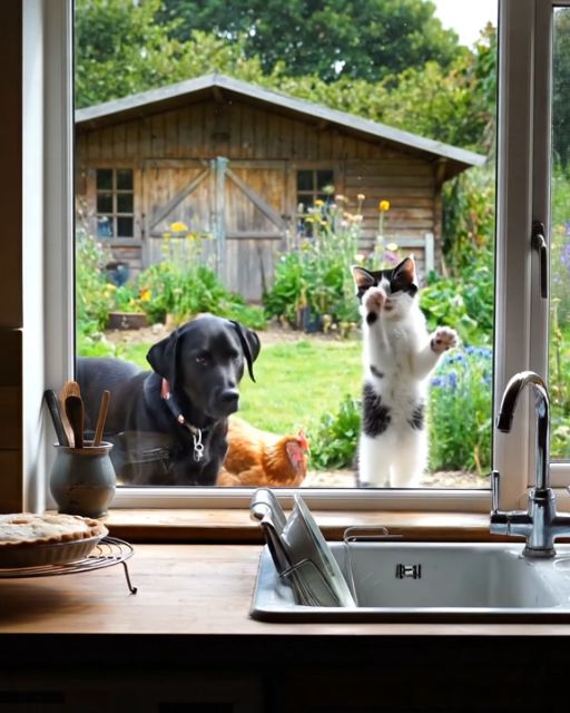 One of those funny moments was planned. Cat, dog, and two hens crowded my neighbor’s window like they were waiting for meals.