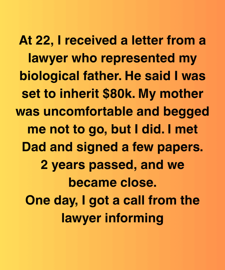 At 22, I received a letter from a lawyer who represented my biological father. He said I was set to inherit $80k. My mother was uncomfortable and begged me not to go, but I did. I met Dad and signed a few papers.