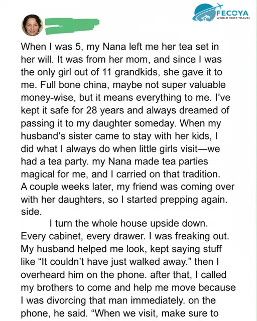 I searched every room, every drawer, and every cabinet in our home. My husband helped at first, saying it must be somewhere, and I tried to stay calm, hoping I had simply misplaced it. Then, while he stepped away to take a call, I overheard something that changed everything. His sister had taken the tea set “to give it to her daughter” because she thought it “deserved to be used.” My heart ached. It wasn’t the object — it was the meaning behind it.
