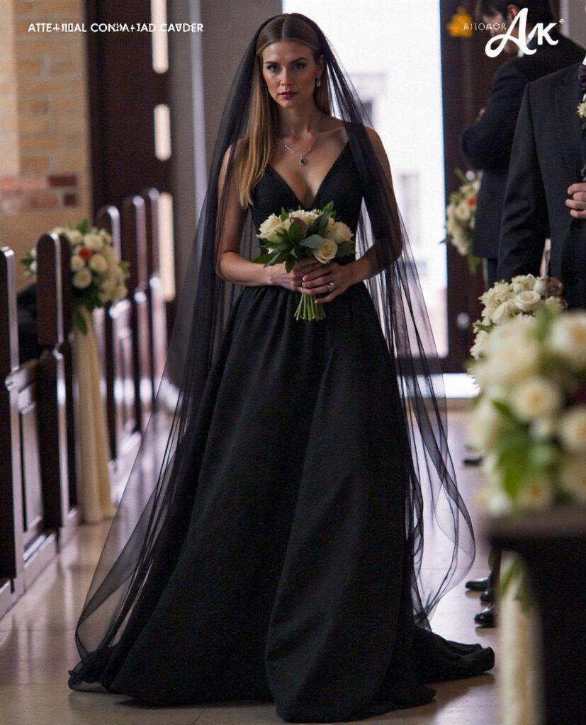 It was not navy or charcoal, but black. It was made with midnight silk, deep and rich, with no lace in sight. The bodice was sculpted and dramatic, the train sharp and shadow-like.