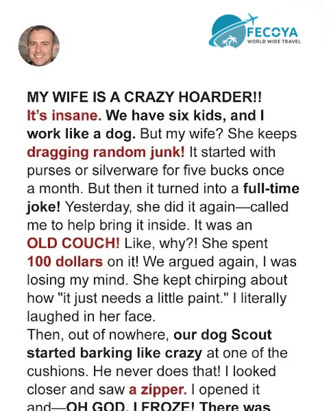 Laughing at the old sofa that his wife had purchased at the flea market, the husband then discovers a hidden zipper a few minutes later.