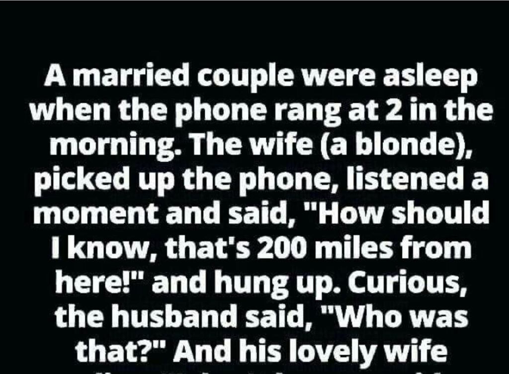 The wife (a blonde) picked up the phone, listened for a moment, and said,“