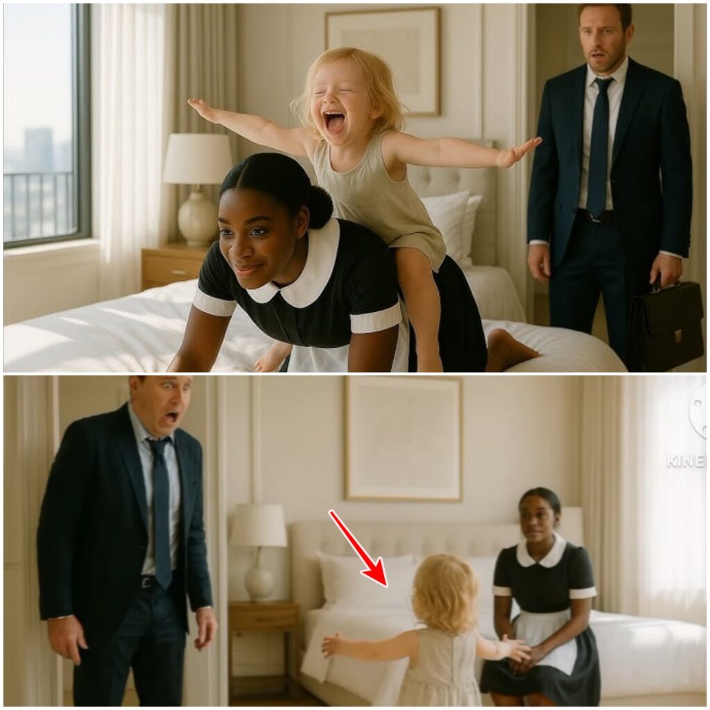 On the bed was Amara, the new maid he had hired just two weeks earlier. Calm and composed, her back straight, she moved slowly on all fours like a living platform. And on her back, gripping her shoulders, was Ella — his daughter, who had never stood, never walked, not even crawled. Ella’s cheeks were flushed with laughter, her small legs wobbling as she tried to balance.