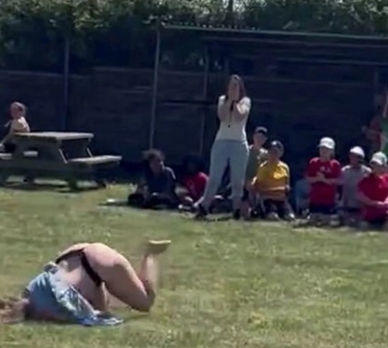 A mum has accidently flashed a crowd of school kids after she tripped and fell during an event at her daughter’s school sports day. Katie Hannaford, 36, was convinced by her eight-year-old daughter her to run in the parent’s race last week. But Katie tripped and fell, accidently mooning the cheering crowd.